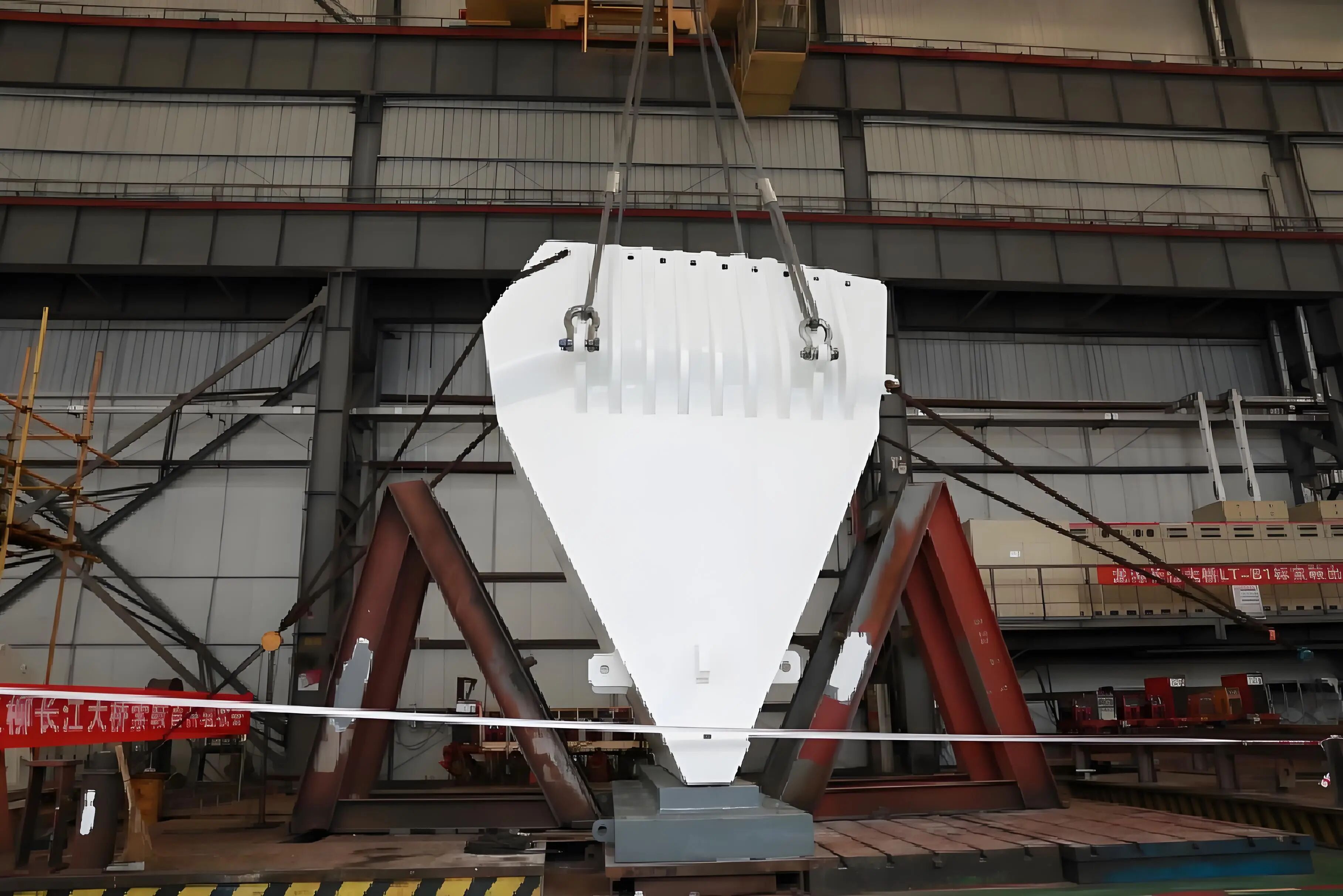 公司承接該大橋主索鞍4套,散索鞍4套,索夾9種共計(jì)288套,纜套12套。其中主索鞍鞍體單重170t,散索鞍鞍體單重125t,均采用鑄焊式結(jié)構(gòu);索夾主要為騎跨式,采用鑄造結(jié)構(gòu),索夾SJ1處采用智能監(jiān)控設(shè)備,能實(shí)時(shí)監(jiān)控索夾螺桿夾緊力,防止其夾緊力過小發(fā)生滑移。為確保該項(xiàng)目保質(zhì)按期交付,公司組建以工程技術(shù)管理人員與各類技術(shù)工人為成員的項(xiàng)目組,先后投入大型數(shù)控落地鏜銑床等各型加工設(shè)備,在2024年9月與10月,分別交付4套主索鞍與4套散索鞍,在2025年5月與11月,分別交付288套索夾與12套纜套,所有產(chǎn)品均提前交付客戶,創(chuàng)下索鞍索夾交付最快記錄,充分展示了公司強(qiáng)勁的生產(chǎn)制造能力與技術(shù)創(chuàng)新實(shí)力,贏得了客戶一致好評(píng)。